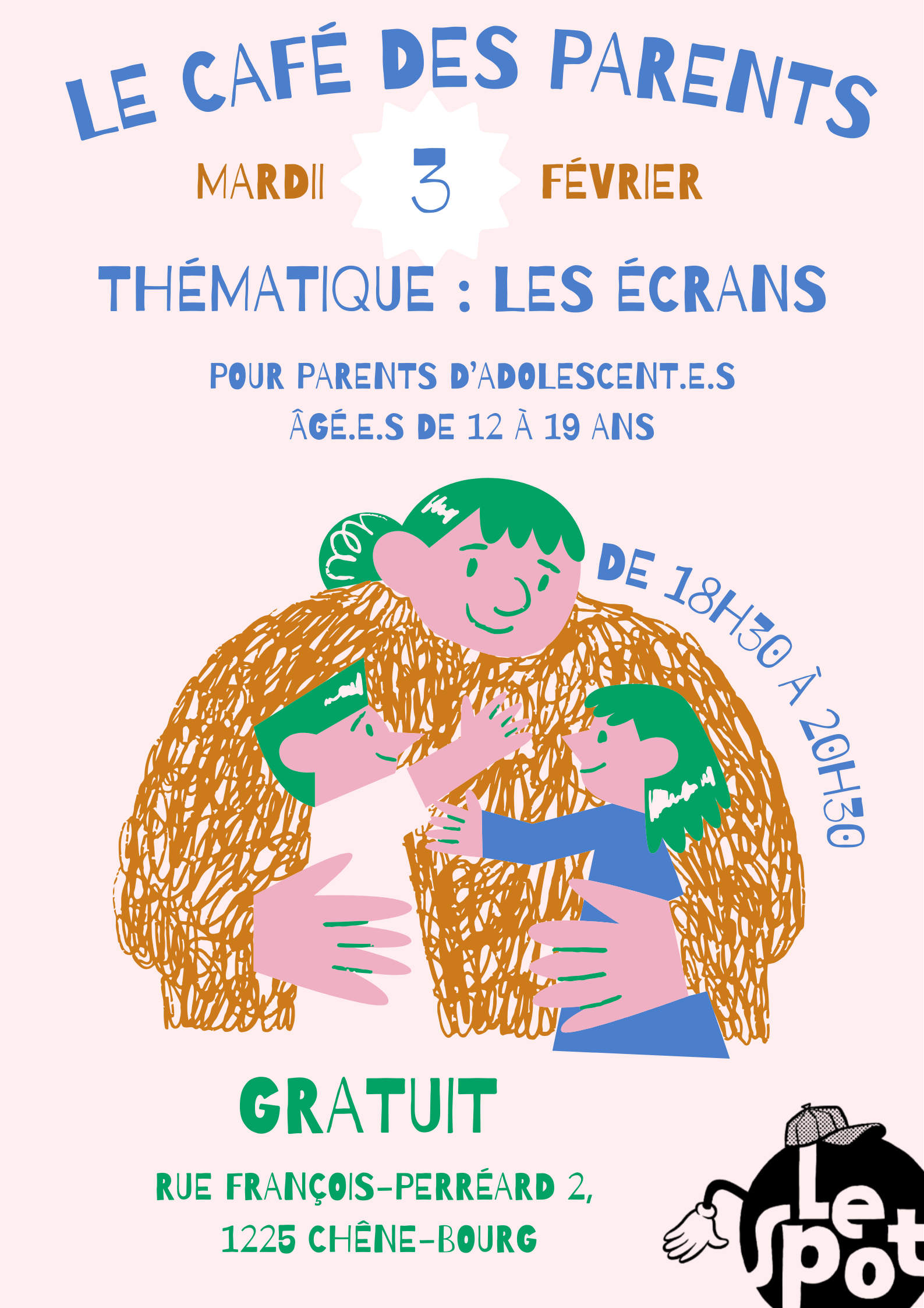 Animés par l’équipe d’animation du Spot avec le soutien d’intervenant·es et d’expert·es externes, les Cafés des parents prendront des formes variées : cercles de discussion, conférences, théâtre-forum… Chaque rencontre débute par un temps d’accueil convivial avec verrée. Ces rencontres sont sans enfants ; un dispositif de garde peut être organisé sur demande pour les parents qui en ont besoin.