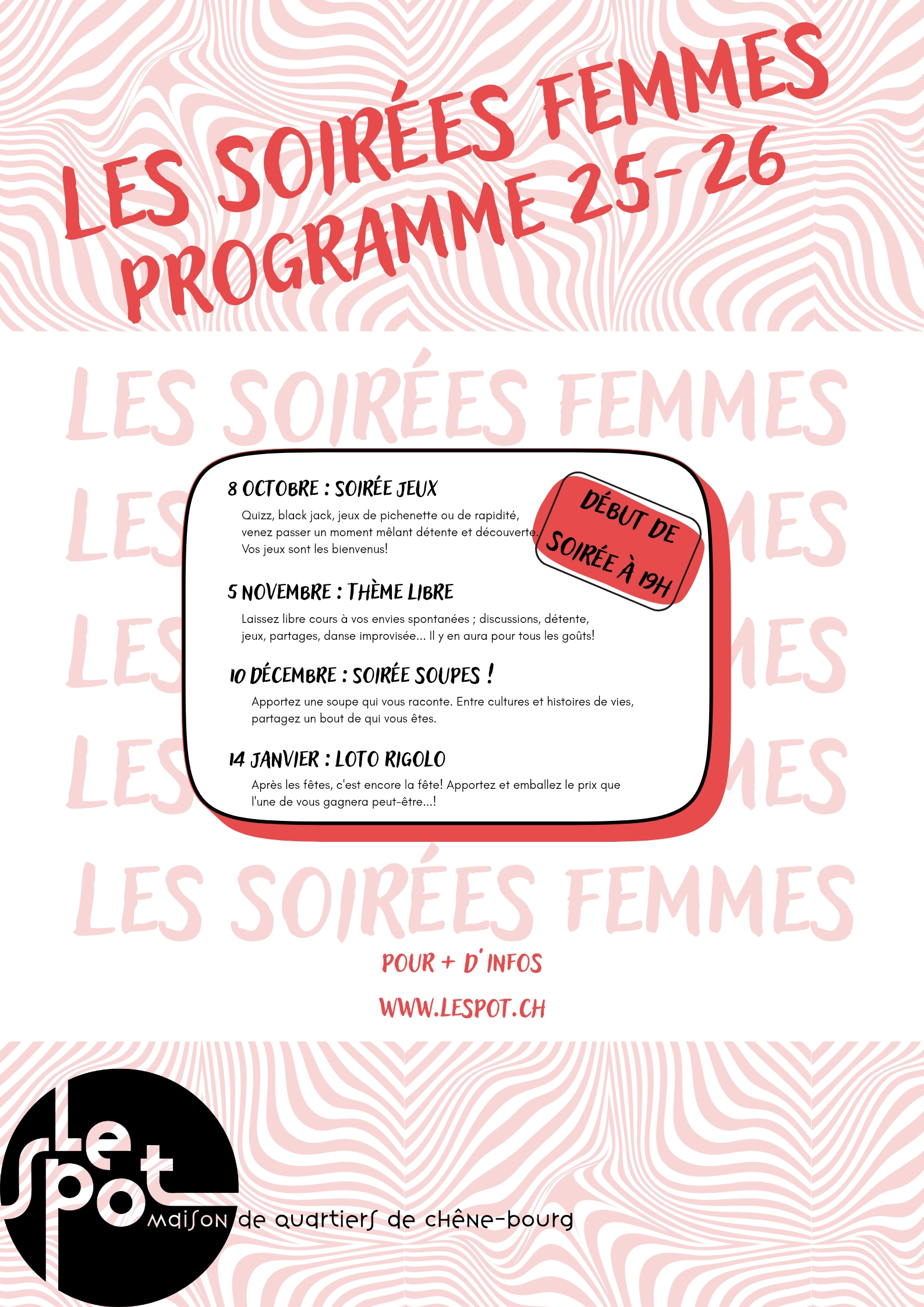 19h : début Soirée Femmes. Amenez du salé – sucré de chez vous pour garnir le buffet.