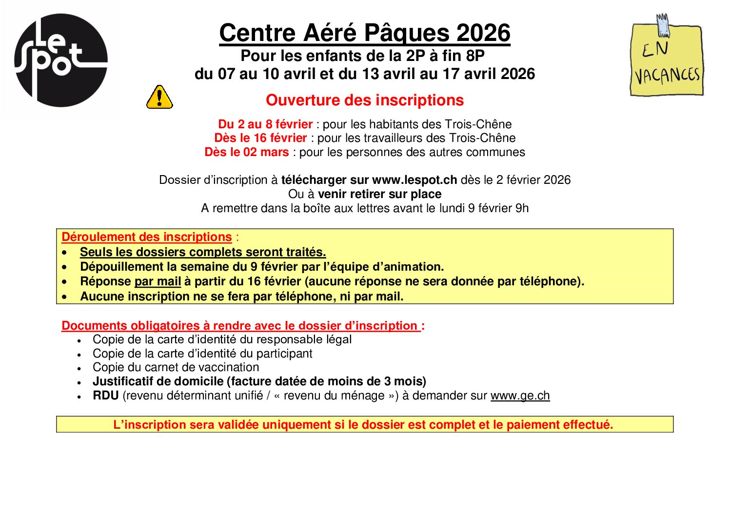 Pour enfants de la 2P à la 8P habitants les communes des 3 Chêne inscriptions réservées du 2 février au 9. Inscriptions ouvertes aux enfants des parents travaillant sur les 3 Chêne dès le 16 février. Dès le 2 mars pour les autres. Dossiers à rendre complet d’ici au 9 février !
